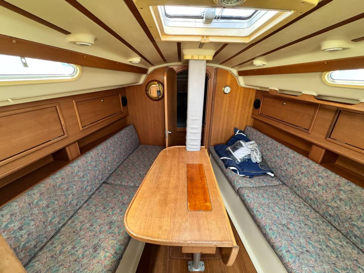 À bord, l’aménagement intérieur est pensé pour la vie en mer. Le carré est spacieux et lumineux, offrant un espace convivial pour les moments de détente au mouillage ou au port.